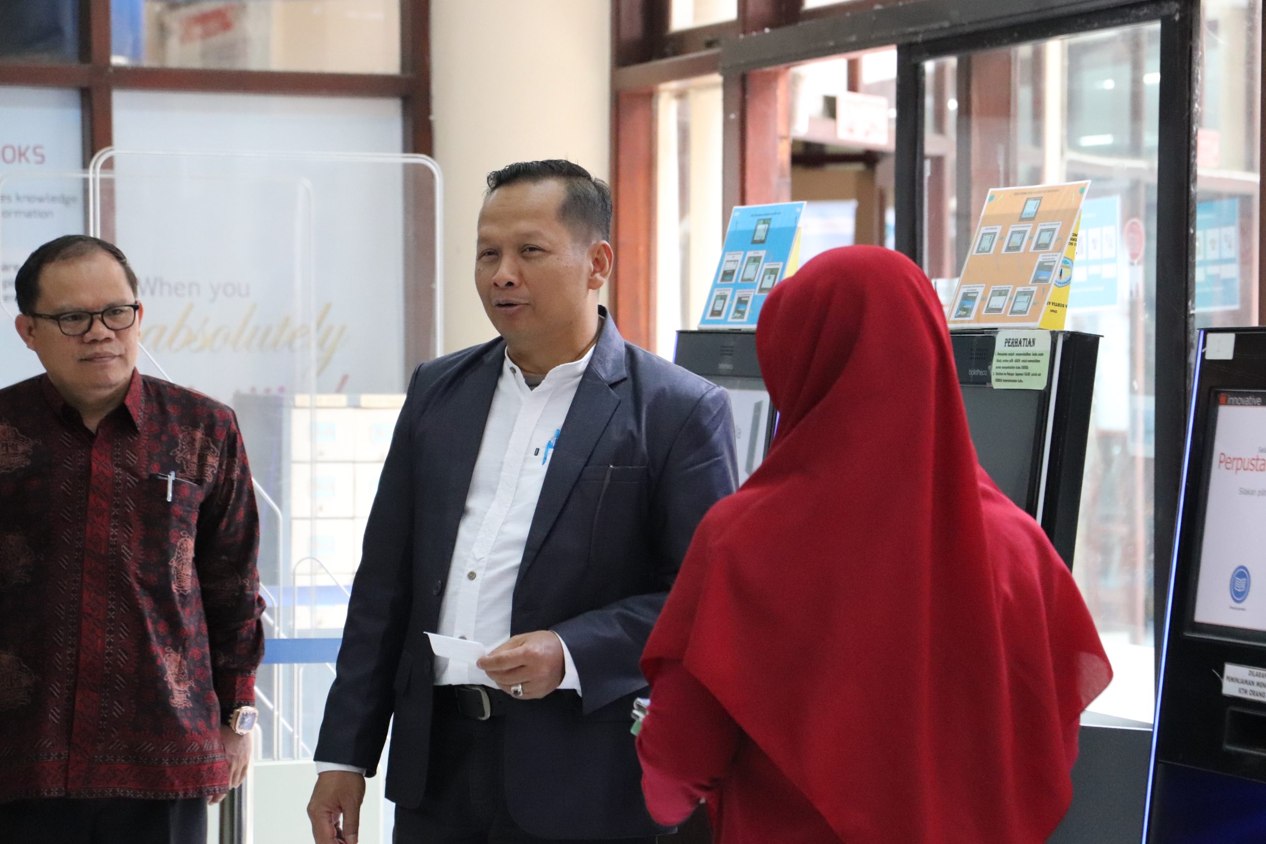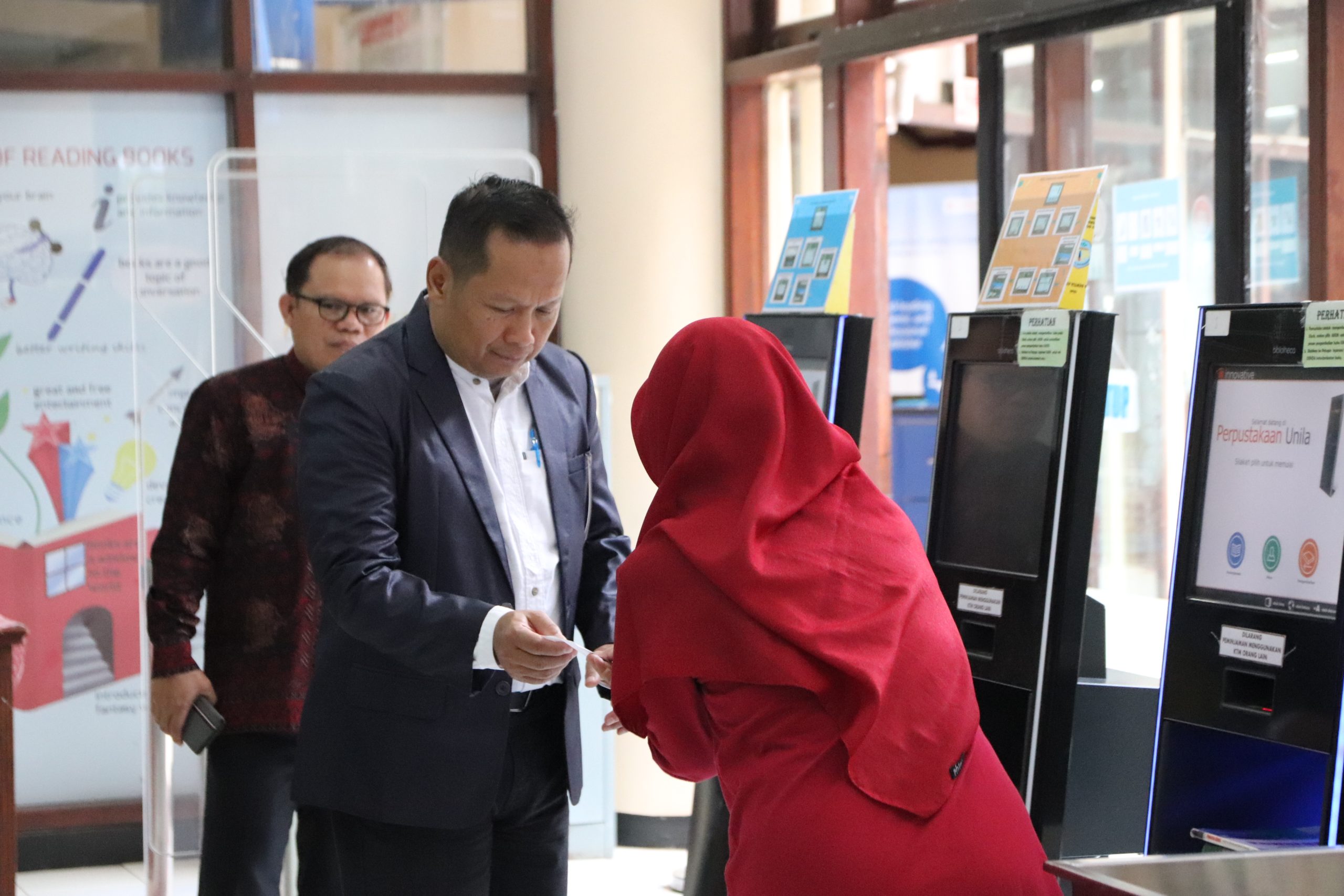 Rombongan disambut oleh Kepala UPT Perpustakaan Unila Dr. Eng. Khairudin, S.T., M.Sc, perwakilan pustakawan, dan divisi litbang dan kerja sama di lobi perpustakaan. Agenda kunjungan asesor diantaranya mengunjungi Layanan Sirkulasi UPT Perpustakaan Unila dan menggali informasi terkait jumlah koleksi buku, jurnal dan ebook yang ada di Perpustakaan Unila.