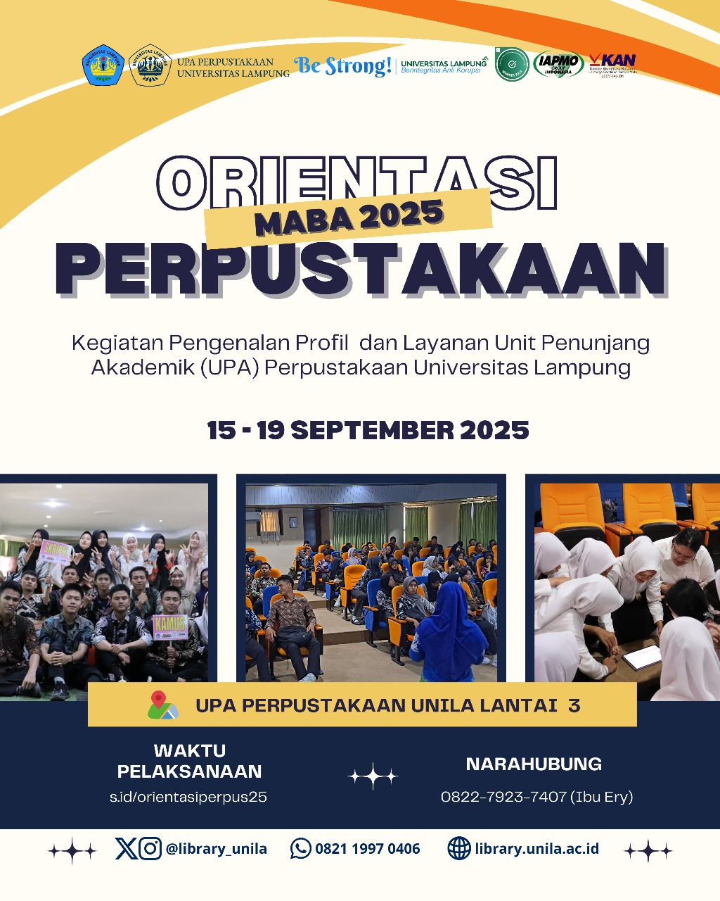 UPA Perpustakaan Universitas Lampung akan menyelenggarakan kegiatan Orientasi Perpustakaan bagi mahasiswa baru TA 2025 – 2026. Kegiatan orientasi akan dilaksanakan pada: