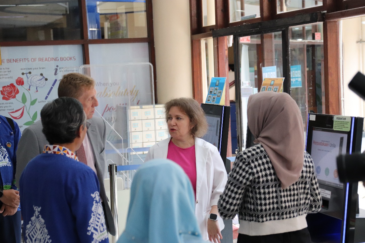 Rektor dan Wakil Rektor UMTE berkunjung ke ruang layanan sirkulasi yang terdiri atas tiga lantai, pada lantai pertama, Kepala Perpustakaan Unila memperkenalkan mesin Self Service KiosK yang merupakan teknologi unggulan milik Perpustakaan Unila.