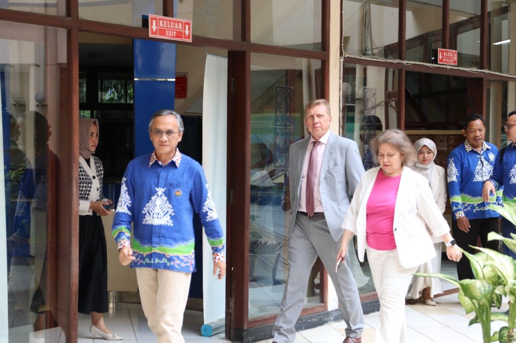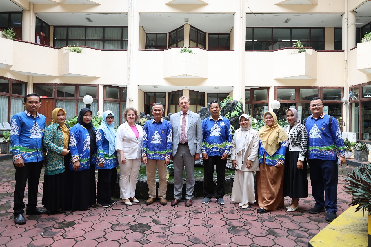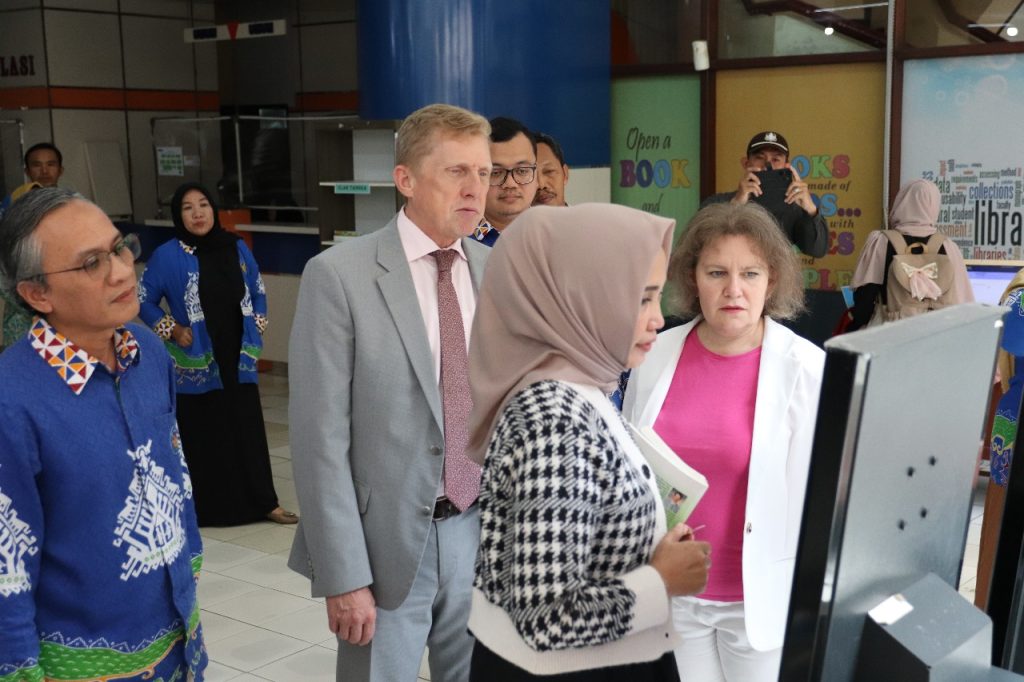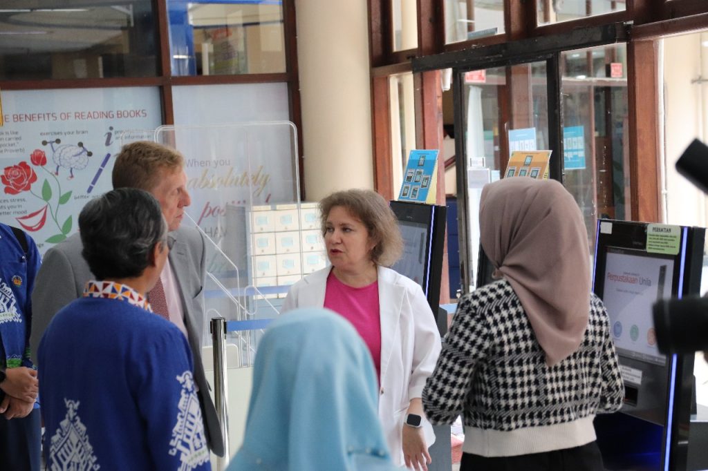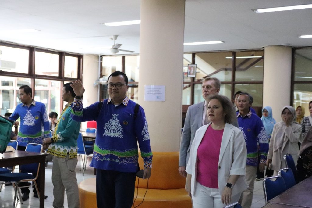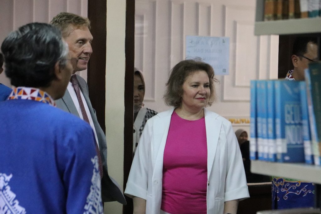 Kedatangan Prof. Dr. Oleg Smeshk dan Prof. Dr. Anna Rumyantseva disambut oleh Kepala Perpustakaan Bayzoni, S.T., M.T., bersama para pustakawan dan staf di gedung perpustakaan setempat.