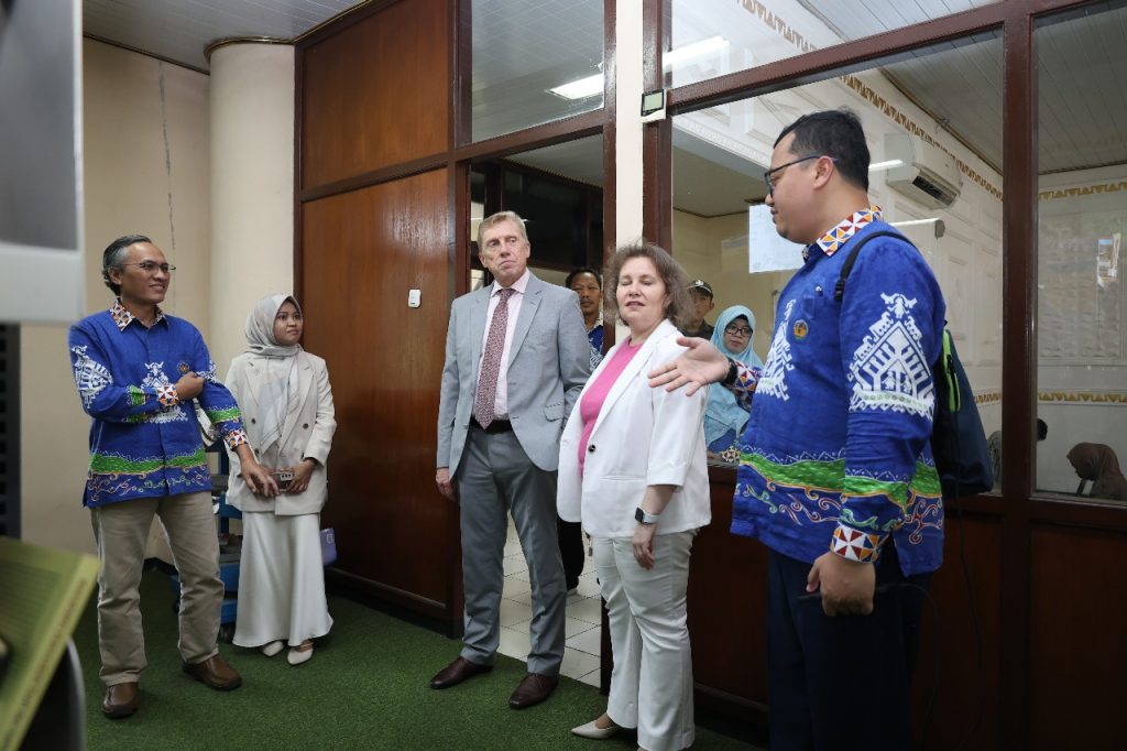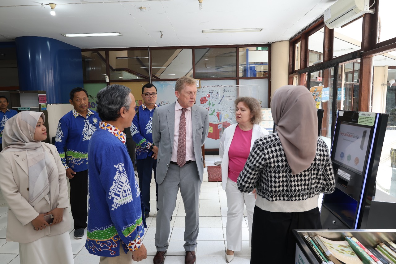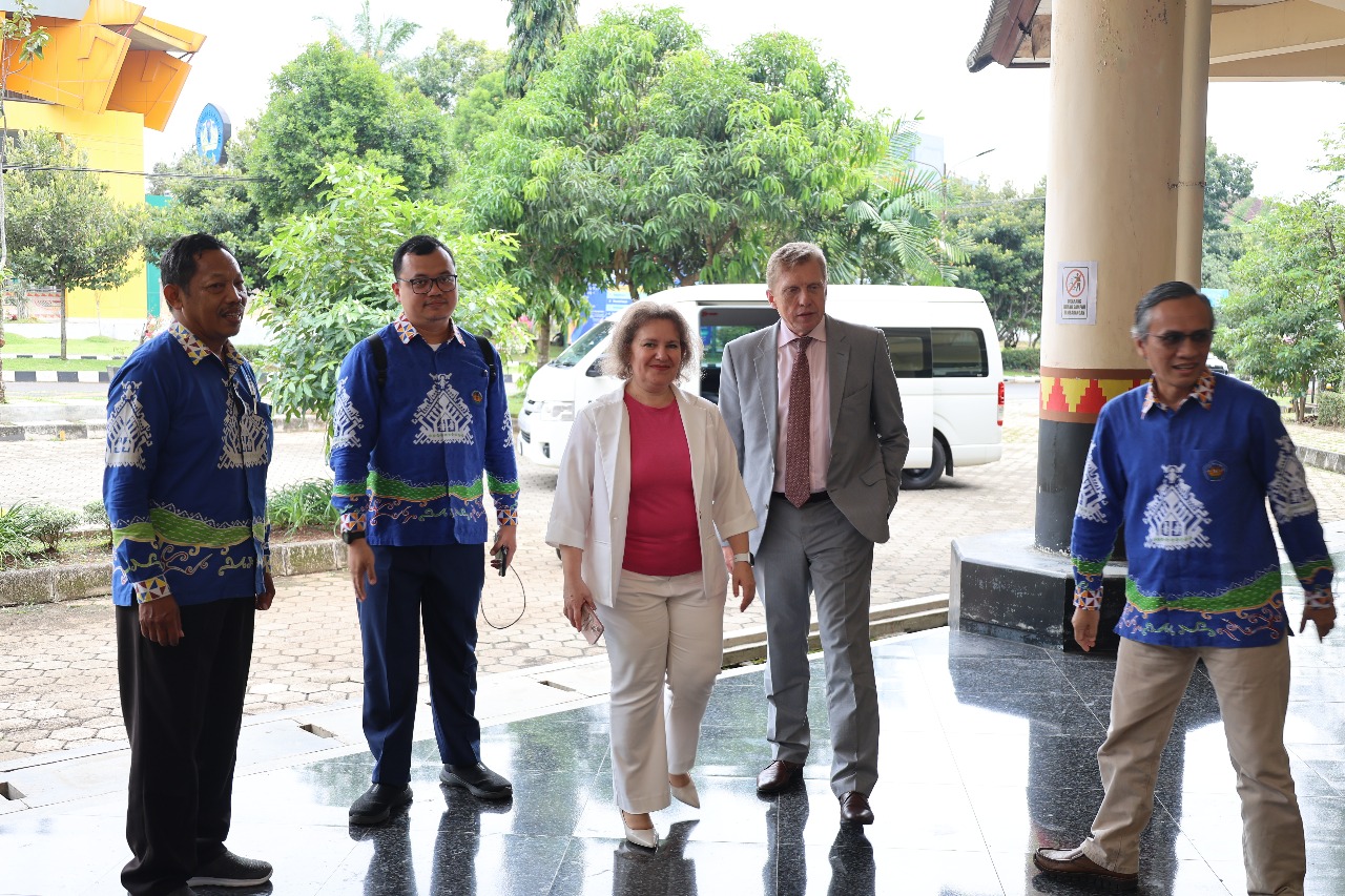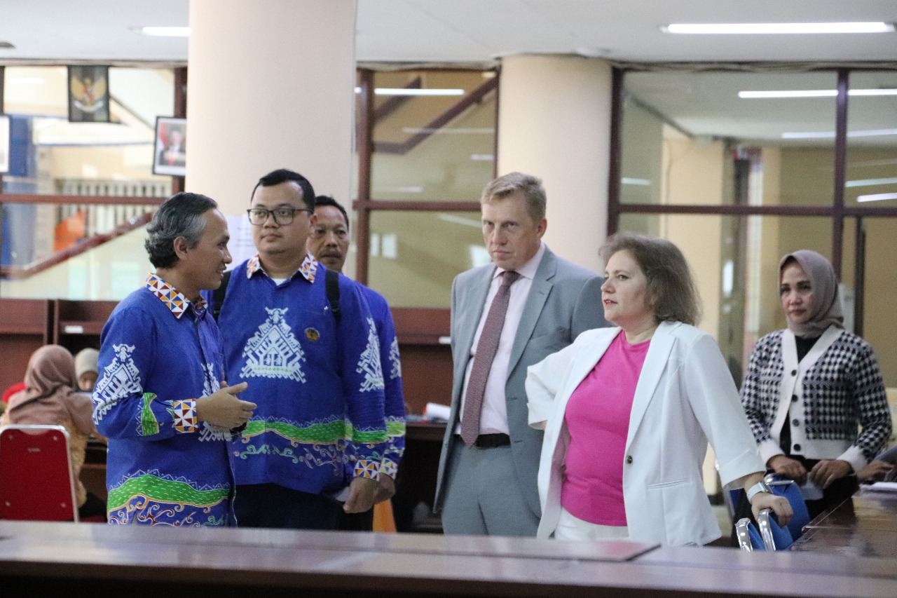 Kedatangan Prof. Dr. Oleg Smeshk dan Prof. Dr. Anna Rumyantseva disambut oleh Kepala Perpustakaan Bayzoni, S.T., M.T., bersama para pustakawan dan staf di gedung perpustakaan setempat.