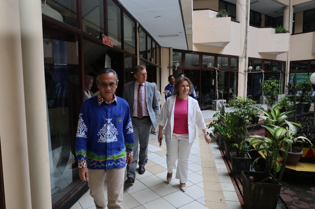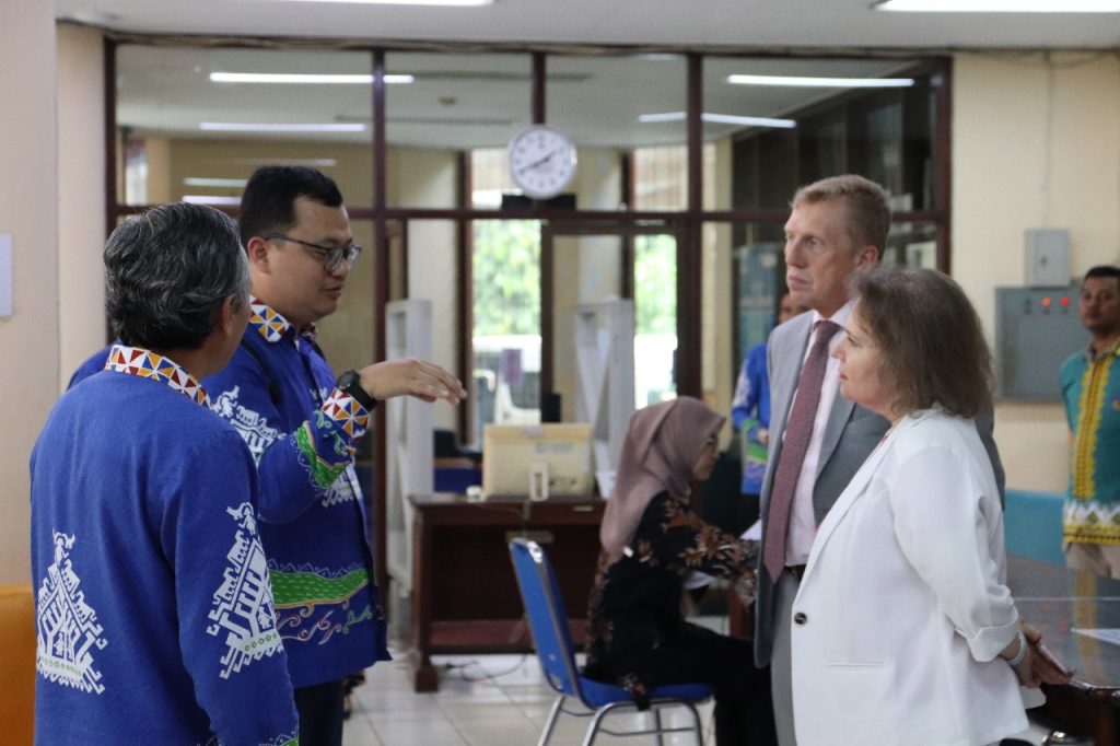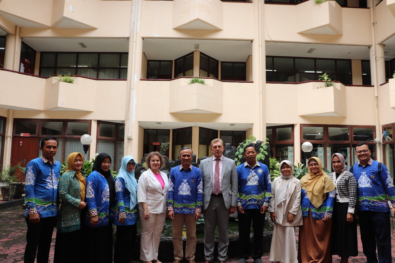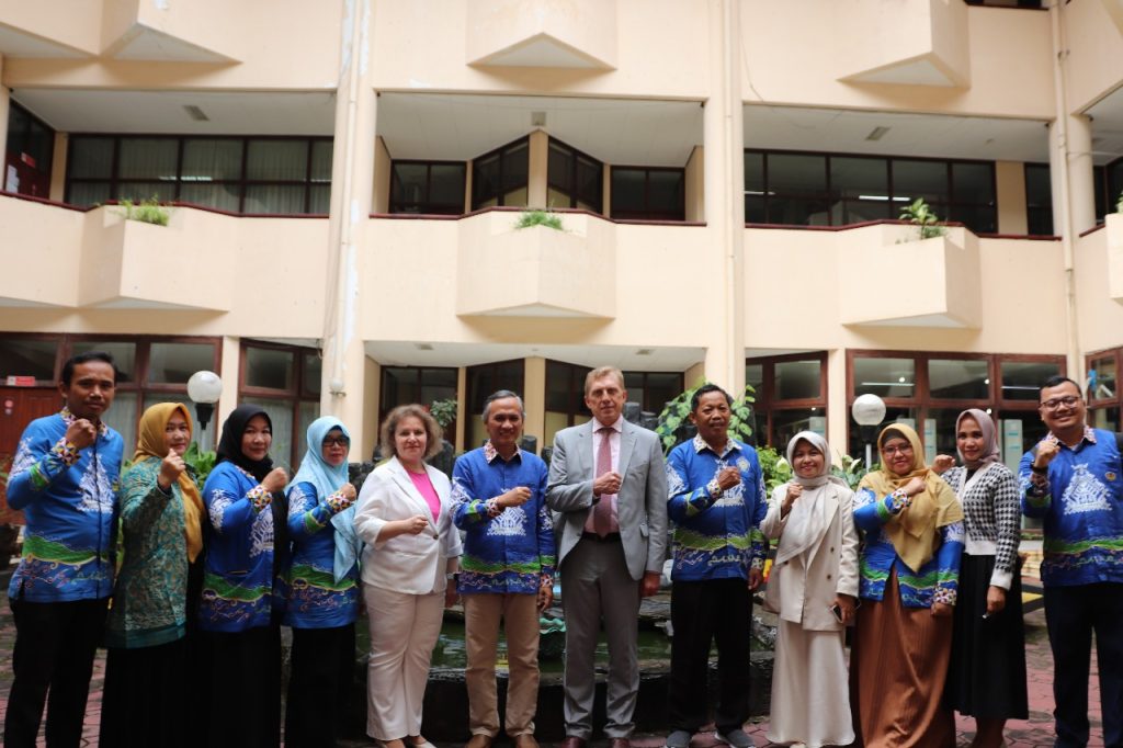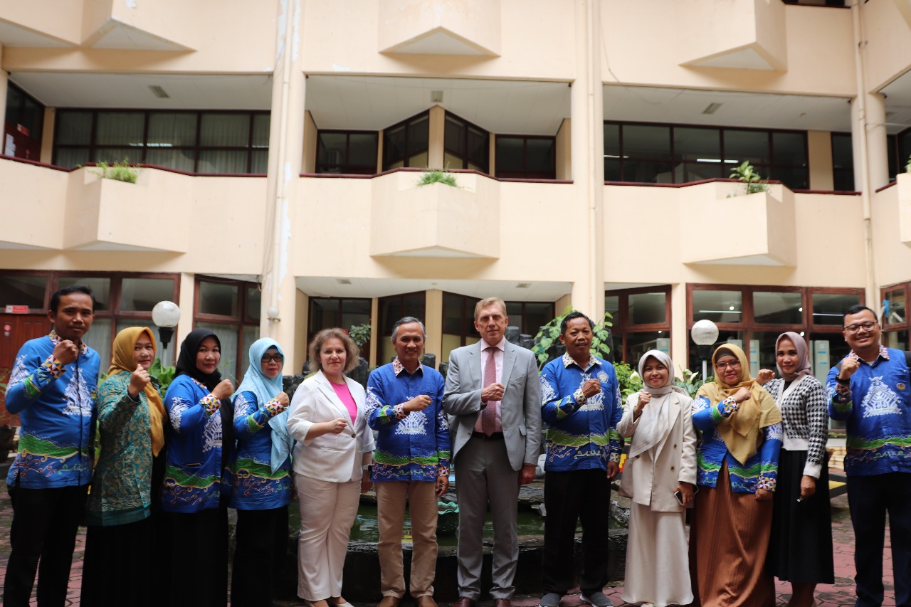 Kedatangan Prof. Dr. Oleg Smeshk dan Prof. Dr. Anna Rumyantseva disambut oleh Kepala Perpustakaan Bayzoni, S.T., M.T., bersama para pustakawan dan staf di gedung perpustakaan setempat.