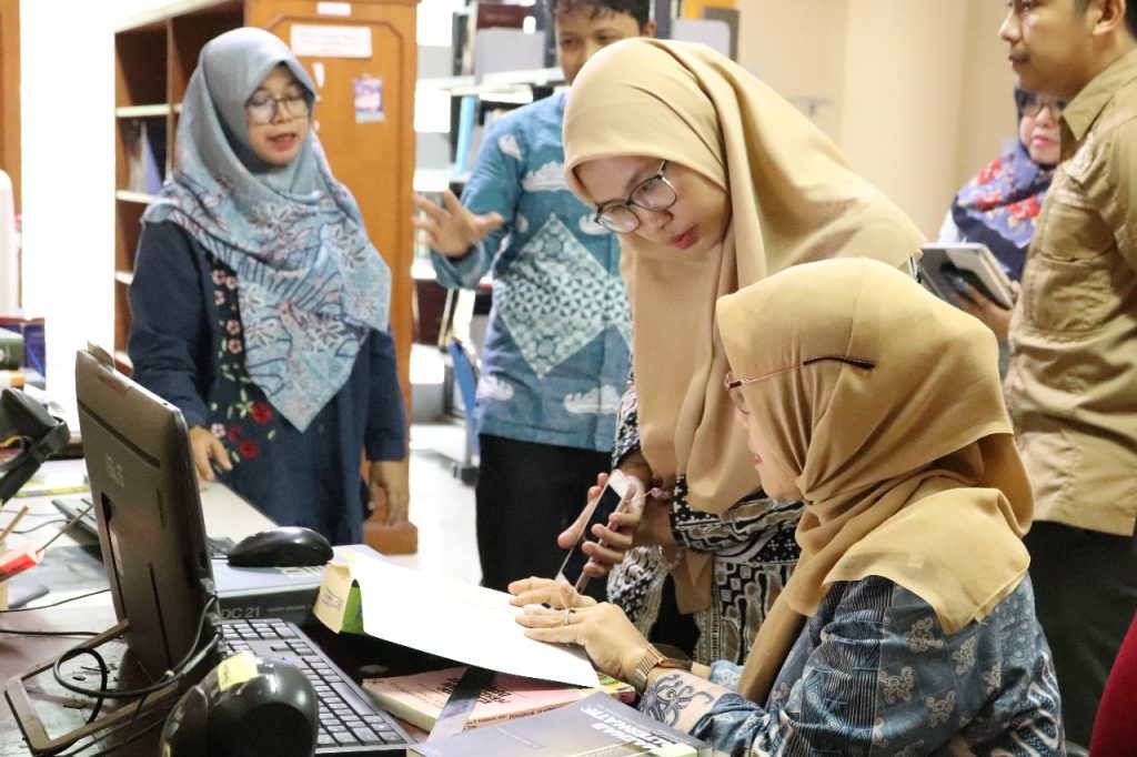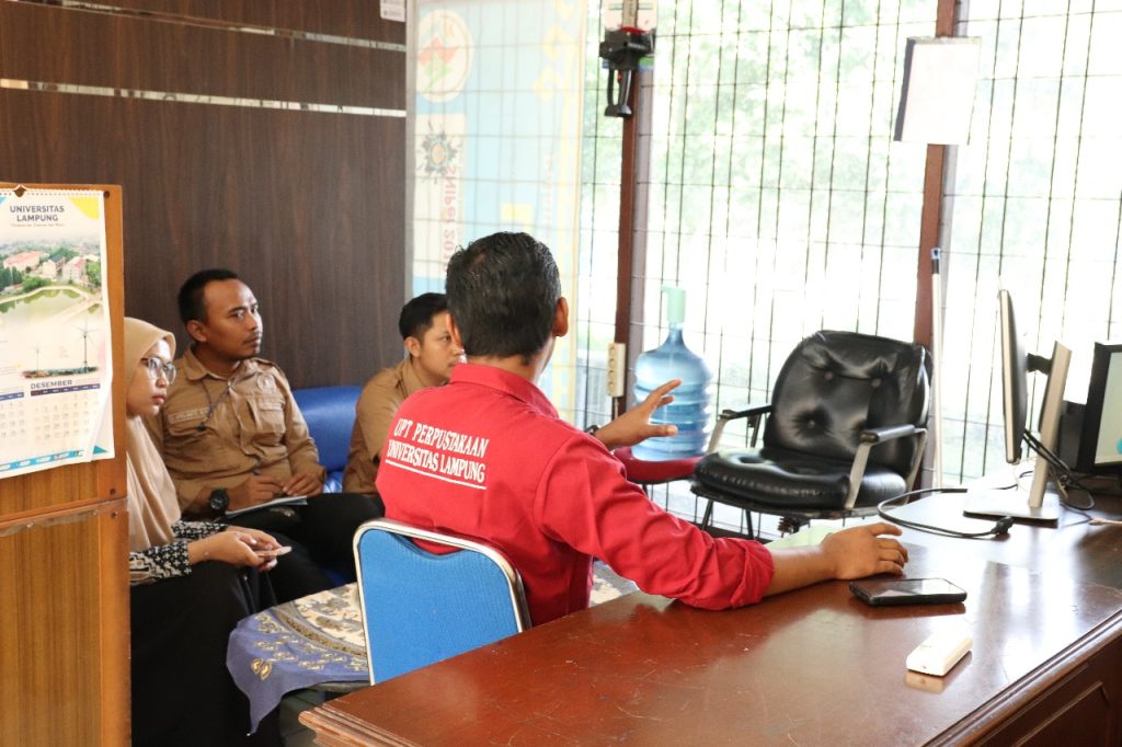 Knowledge sharing dilakukan bersama perwakilan UPA Perpustakaan Unila diantaranya Endah Kurniasari, S.I.Kom., Yuli Yanti, S.I.Kom., dan Angelino V.S., S.I.Pust sebagai perwakilan pustakawan.